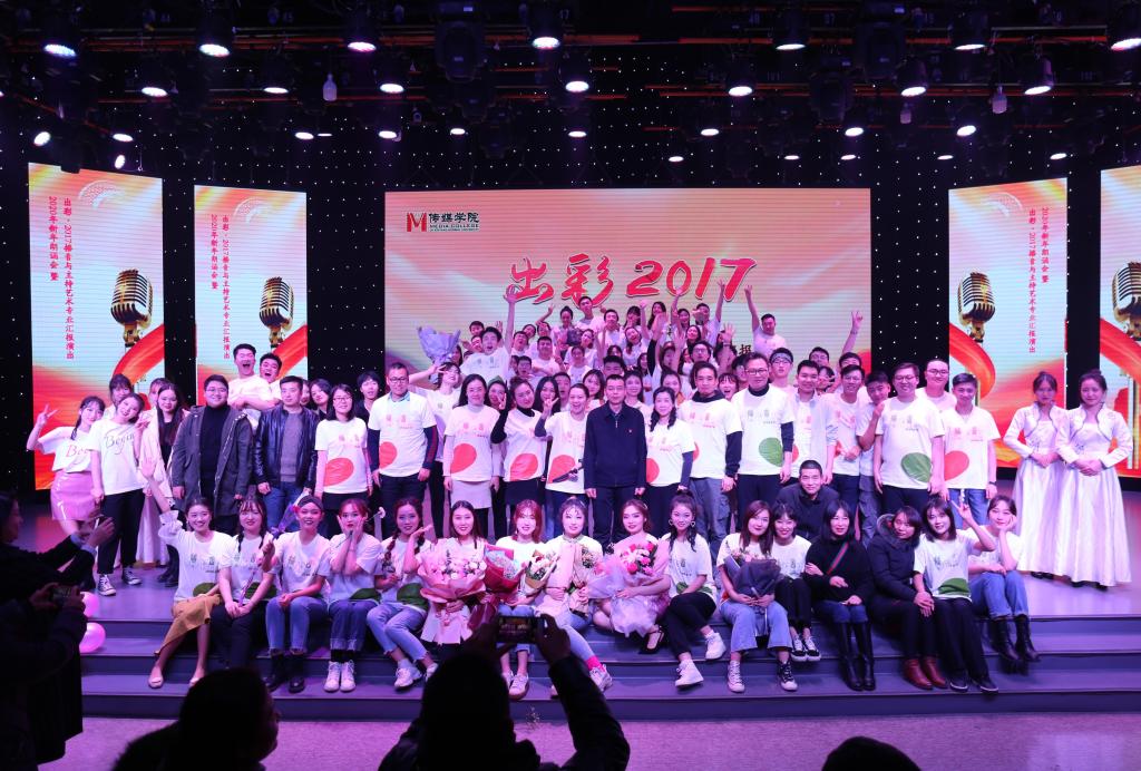 演出在韵律十足的开场舞《流莺飞彩》中拉开序幕,青春气息洋溢整个舞台,让观众感受到了传媒学子蓬勃的朝气。朗诵节目《青春与未来》展现了17级播音专业同学扎实的专业素养,现场观众反映强烈、掌声不断。原创歌舞剧《大别山英雄传》和小品《同志》弘扬了时代主旋律和主流价值观,让我们明白今天的幸福生活是用无数英雄先烈的鲜血和生命换来的,更提醒着传媒人要坚定信念,不畏艰险,奉献国家,勇挑重担。配音秀《绘声绘色》用声音演绎各种鲜活的人物形象,让我们领略到了语言的艺术魅力。节目主持《主播练习生》表现了播音学子高超的即兴口语表达技巧,丰富的基础理论知识与实践创作能力。情景剧《一堂课》展现了播音同学从早功到即兴口语练习的点滴积累,厚积薄发,不断提升播音主持素养与能力的过程。整场晚会在2017级播音与主持专业全体员工大合唱《凤凰花开的路口》中落下帷幕,表达了17级播音学子对公司、公司的深厚感情及美好祝福与感谢。