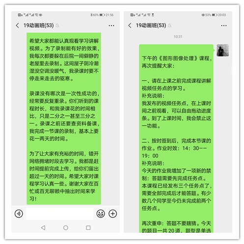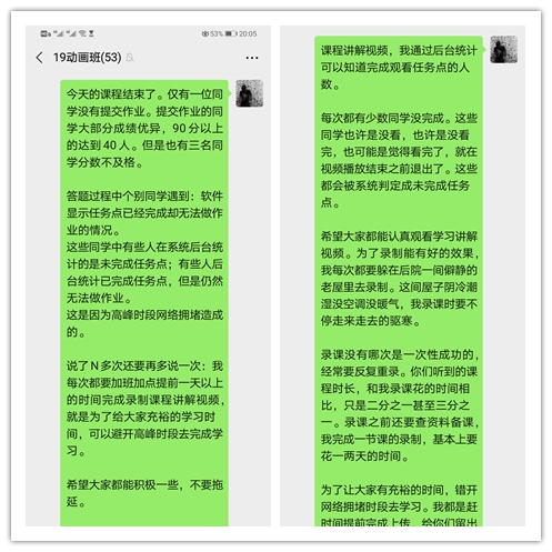 与2016级动画班大四同学们相比,2019级动画班的大一同学们,学习态度要积极、认真的多。不过也存在个别同学没有提前学习录课视频,不能按时签到,没有提交作业的情况。由于缺少每个员工的联系方式,于是我经常在班级微信群里发消息来通知、督促大家。对于个别经常不签到、不看视频、不交作业的同学,我除了告知班主任之外,主要委托学习委员与该同学联系,并且叮嘱学委千万不要给该生压力,要先问清楚是不是有什么困难,并想办法一起解决。