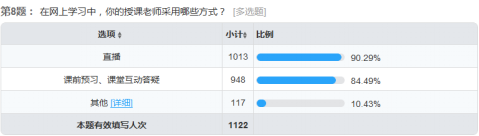 据调查,绝大部分员工对网上教学满意度较高,认为自己获益匪浅。其中,对老师上课质量满意度92.42%,对网上教学的学习氛围满意度87.17%;约三分之二的员工认为网上教学便于查询资料、学习资源丰富、学习活动新颖有趣;在学习终端上,以手机和电脑为主;在学习软件上,超星学习通、钉钉和微信最常用;大家对直播和课前预习、课堂互动答疑等授课方式比较认可;约三分之二的员工希望老师及时回答问题和反馈作业情况;播音主持系张世海、张杰、江远方、廖悦等,广播电视系张霞、冯莉颖、侯丹丹、郑坤等,戏剧影视系罗妞、孙鑫、刘子洋、郜扬等,动画系范少华、彭勃、赵永彬、栗劲草等,艺术理论教研室李文英、张雅玲、刘鹏等,《影视配音基础》《新闻采访与写作》《表演Ⅰ》《影视剧改编》《公共关系》《新闻法规与职业道德》《非线性编辑》《影视艺术学》《话剧剧本与写作》《多媒体课件制作》《世界动画史》《原画设计》《西方文学经典导读》等课程,深受员工喜爱。同时,员工也提出了突出课堂重点、增加趣味性、延长签到时间、增加课堂互动、减少长串语音、缺少实践环节等意见。