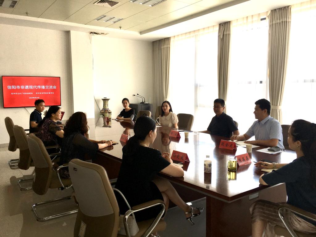 6月14日上午,公司与信阳市文化广电和旅游局举行了信阳市非遗现代传播交流会,党委书记胡波、戏剧影视系主任段金龙,市文广旅局副局长滕小玉及有关部门、科室负责人参加交流对话活动。