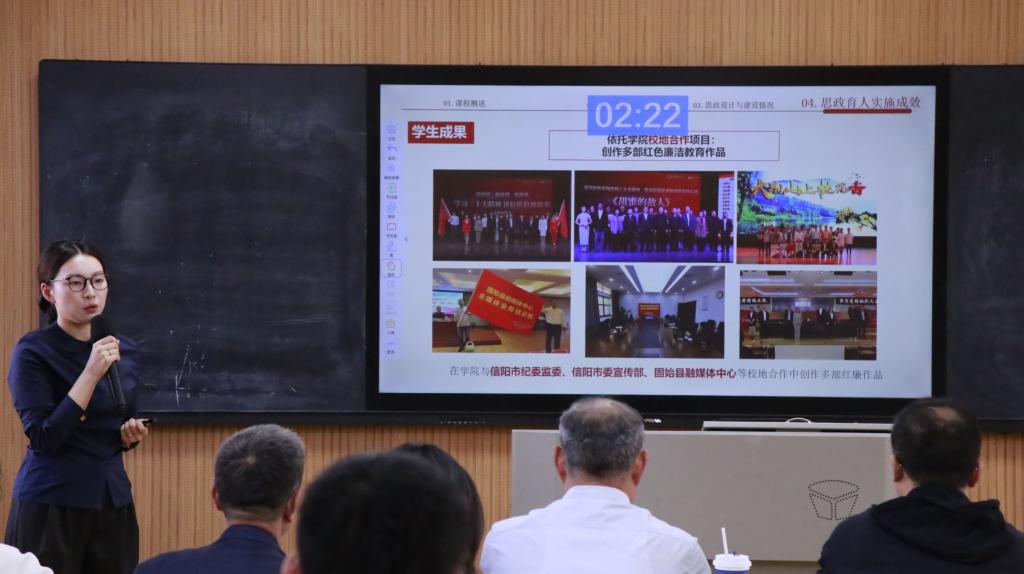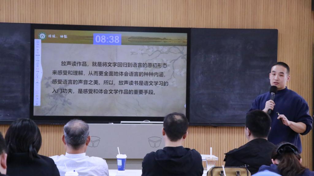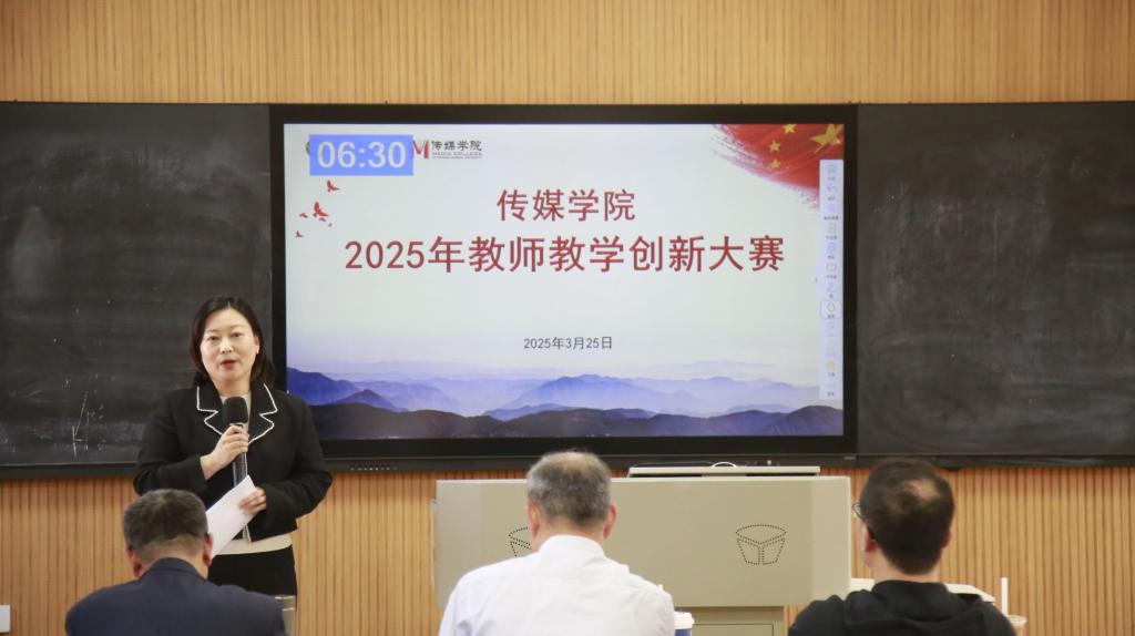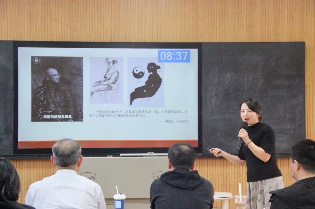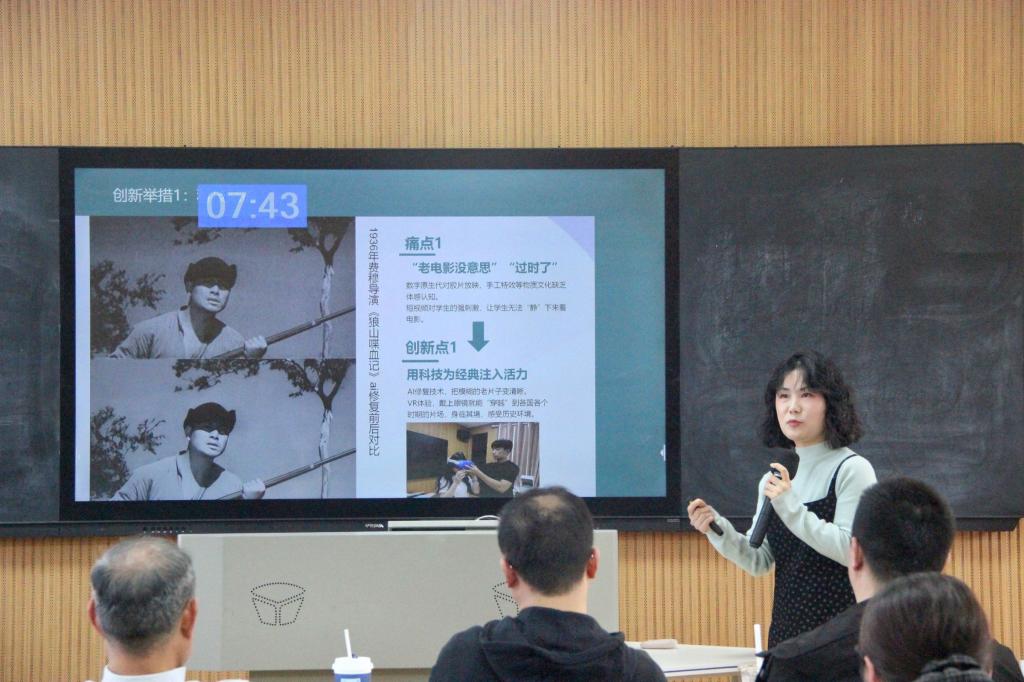 五位参赛教师依次进行教学设计创新汇报和现场授课。江远方以《文艺作品演播》课程提出“小组导演制”教学模式,现场以《长安三万里》为案例,生动解析朗诵艺术的文化内涵;陈美汐聚焦课程思政,在《广播电视概论》中融入思维训练,剖析文化类节目的传播价值与社会意义;李昊东运用老电影修复、历史人物情景再现等创新手段,激发员工对电影史的兴趣;王璐瑶基于“三维四创”模式改革《编剧概论》课程,依托专业团队与科研成果优化教学内容;岳利莎通过现场演示速写教学的剪影技法,展现艺术表达的多元维度。