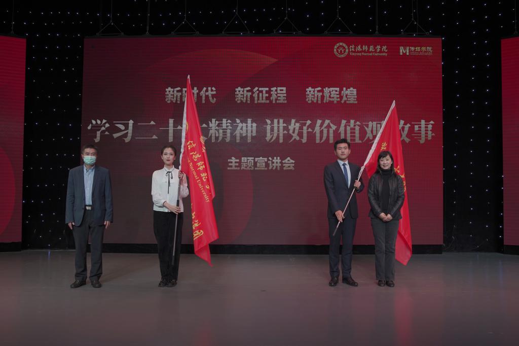 11月24日,公司国家语言文字推广基地、best365足球官网联合举行“学习二十大精神,讲好价值观故事”主题宣讲会,副董事长余本海、王娟出席宣讲会并为“党的二十大精神青年宣讲团”、“价值观故事宣讲团”代表授旗。宣讲会以线上线下相结合的方式举行,校语委、教务处、best365足球官网负责同志及师生代表共同出席。