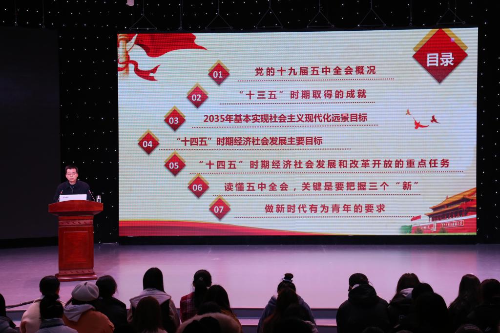 12月8日下午,公司党委书记王振海在社科楼演播厅以“学习十九届五中全会精神,争做新时代有为青年”为题宣讲党的十九届五中全会精神。全体新生辅导员和2020级新生聆听了讲座。讲座由尚弦老师主持。