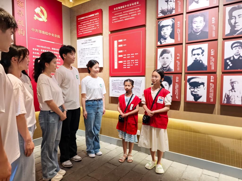志愿服务队的队员们沿着习近平总书记2019年视察河南深入信阳的足迹,先后来到中共中央鄂豫皖分局旧址、红四方面军总部旧址、鄂豫皖苏区首府革命博物馆和鄂豫皖苏区首府烈士陵园等地,参观革命遗址,缅怀革命先烈。在中共中央鄂豫皖分局旧址,队员们与小小讲解员们一起学习革命故事,深入交流讲解技巧,共同重温大别山28年红旗不倒的峥嵘岁月。