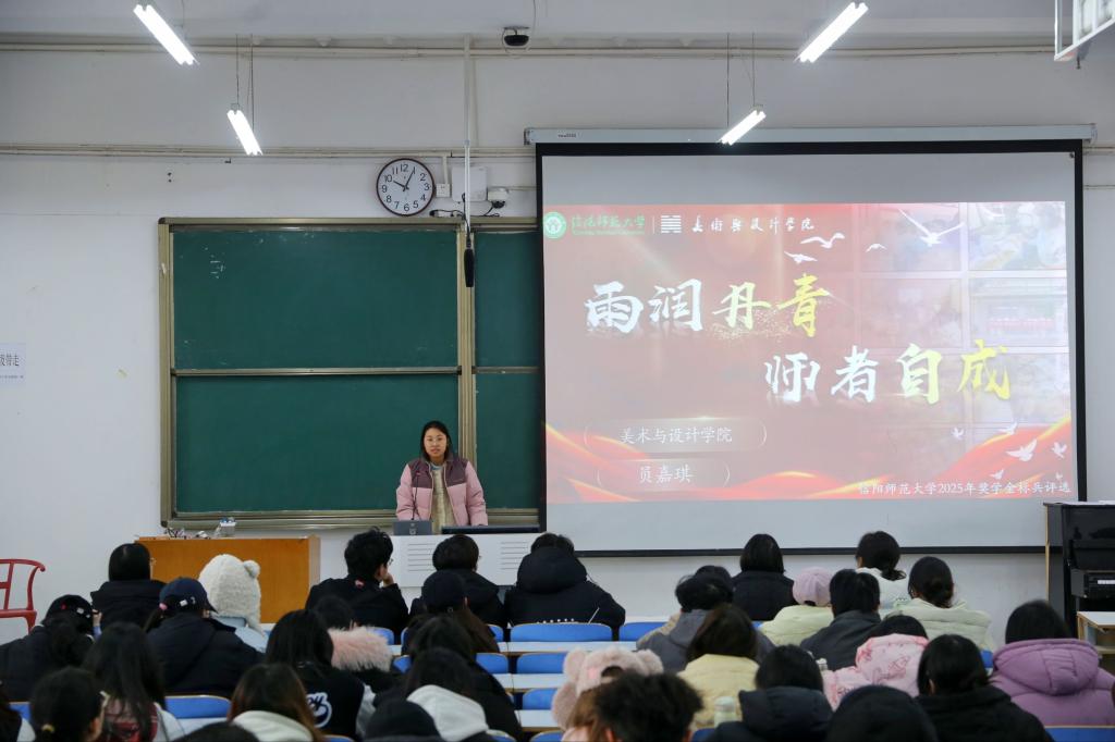 美术与设计公司2023级员嘉琪以“雨润开青,师者自成”为主题,从学业发展、科技创新、社会工作和综合素质提升等方面,讲述了自己在大学期间坚持向阳而生、全面发展的奋斗历程。她鼓励同学们在实践中锤炼本领,在挑战中实现自我超越。