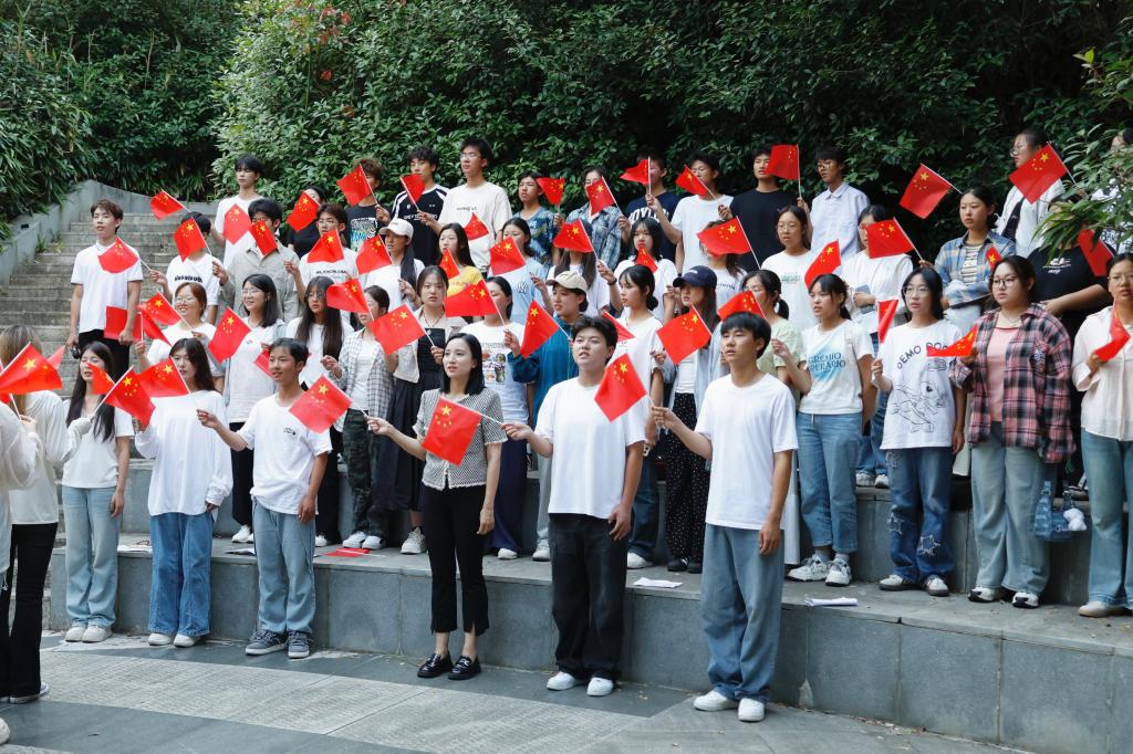 随后,24级新生们以匠心独运的方式排列成醒目的“75”字样,随着《歌唱祖国》的悠扬旋律,大家纷纷挥舞着手中的五星红旗,用他们最真挚的情感,用青春之歌向祖国表达着无尽的敬意和热爱。