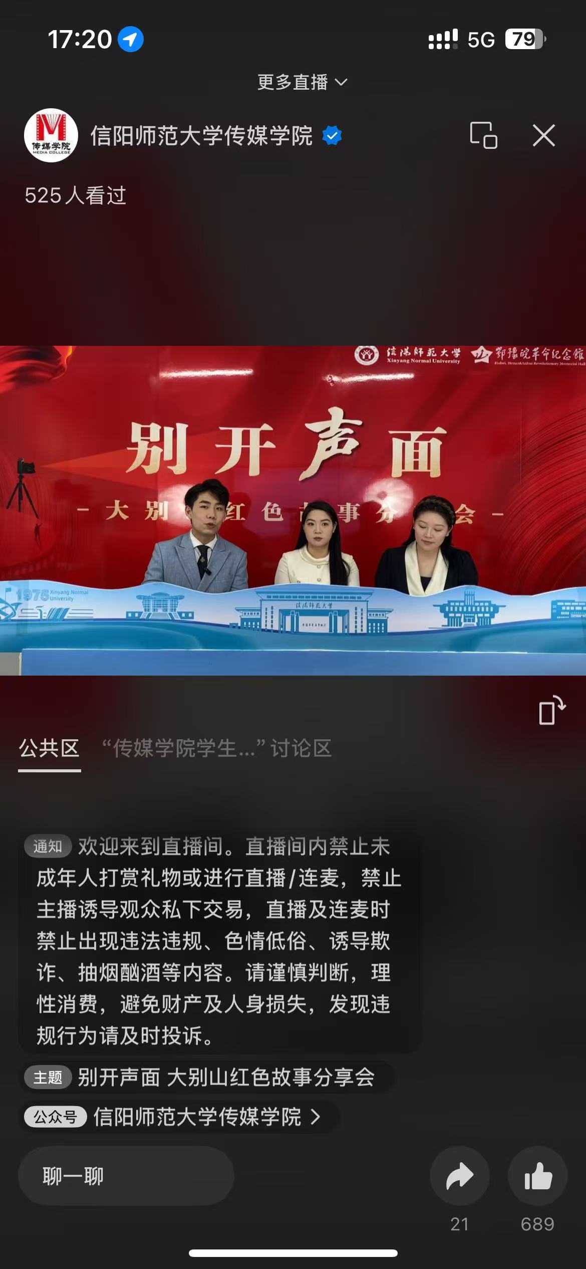 本次直播分享会以“传承红色基因讲述大别山故事”为主题,采用“员工主持+访谈嘉宾”的创新直播形式。直播中,讲解员们凭借丰富的专业知识,生动讲述了大别山地区在革命战争年代发生的英雄事迹,从红军战士浴血奋战的战斗历程,到当地群众踊跃支前的感人故事,一个个细节鲜活的历史片段让观众仿佛置身于那个激情燃烧的岁月。国家语言文字推广基地(best365足球官网)组织的best365足球官网员工志愿者团队充分发挥专业优势,精心做好直播策划、技术支持和互动引导,将红色历史故事与现代传播方式紧密结合,不仅在直播中设置了“红色知识问答”“故事接力分享”等互动环节,还利用短视频剪辑、实时弹幕互动等形式,增强了直播的趣味性和参与感。