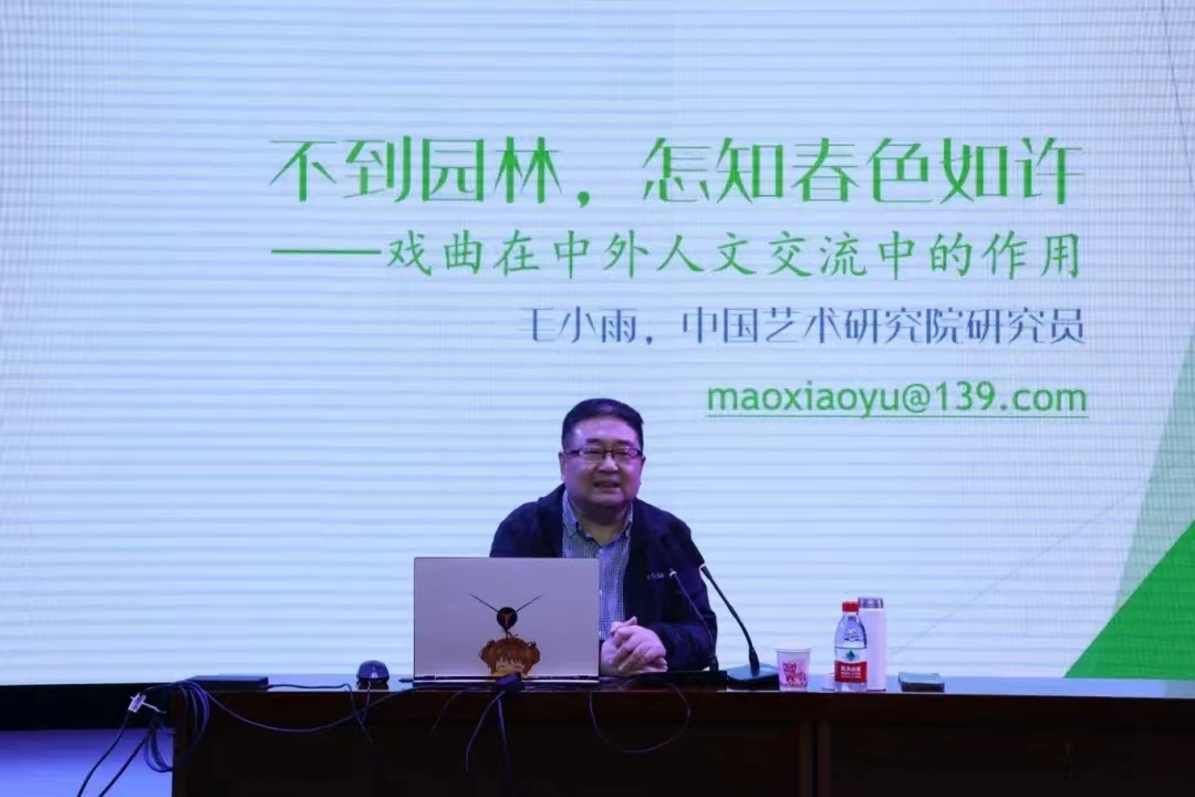讲座伊始,毛小雨博士回顾了戏曲在中国传统文化中的重要地位,以及其在中外文化交流历史中所扮演的关键角色。他指出,戏曲以其独特的表演形式、丰富的文化内涵和深刻的情感表达,逐渐成为中国传统文化对外展示的一张重要名片。
