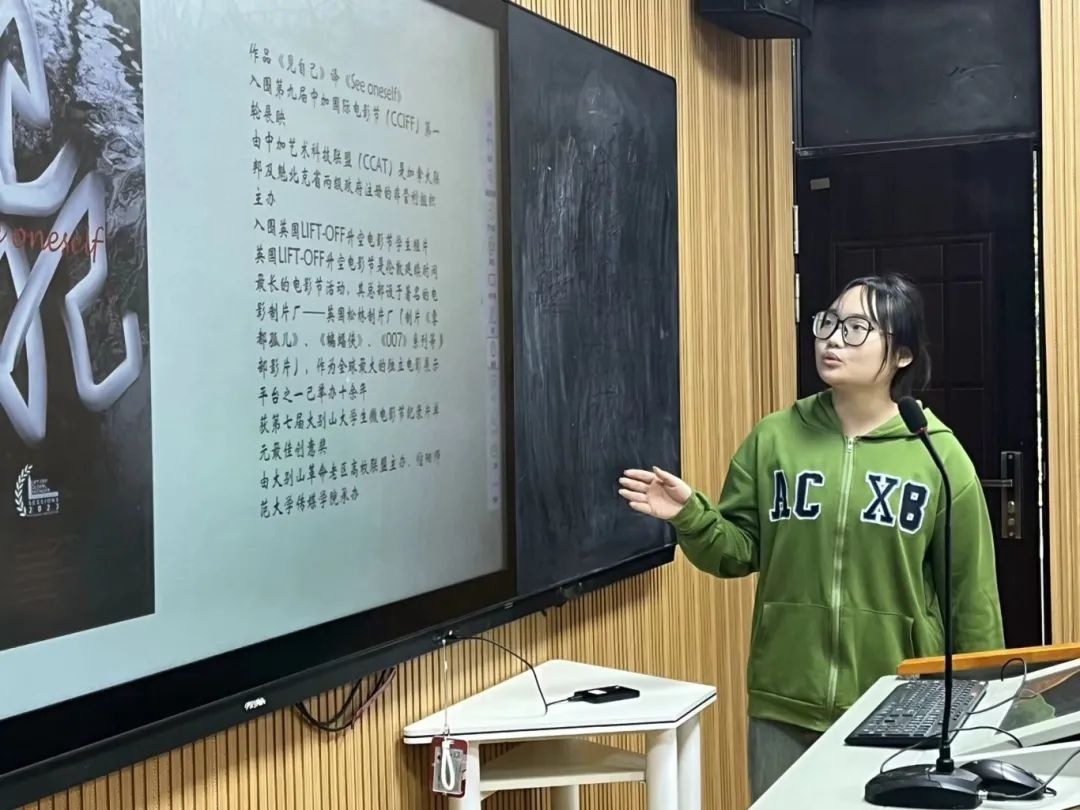 在历届学术月获奖作品展映环节,师生一同观看了《何以信师大》《不辞青山》《见自己》等员工优秀作品。员工代表董振鹏提到在拍摄过程中大家要团结一致,无论是在遇到困难时还是在取得成功时,团队成员之间始终要相互支持、相互鼓励,这种团结协作的精神不仅能增强小组配合的默契度也将成为我们人生中宝贵的财富。员工代表韩志倩建议大家在身边热点中挖掘选题,左佳丽及李文博同学更多是鼓励大家进行创作题材及表达方式的创新,黄奥成及董欣茹同学主要和同学交流拍摄前期与被摄对象沟通的技巧。
