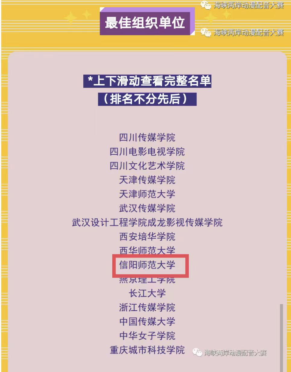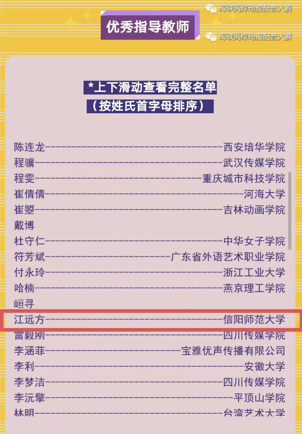 2023年10月27日,第一届海峡两岸动漫配音大赛在厦门举行。本次大赛由中国电视艺术家协会指导,国台办新闻发言人、国台办新闻局副局长、一级巡视员陈斌华,中国电视艺术家协会分党组成员、副秘书长高健等领导和嘉宾出席,并为两岸获奖选手们颁奖。河南省人文社科重点研究基地中原戏剧影视文化研究中心播音与主持艺术专业两个代表团,九名优秀学子刘玮驿、詹雅婷、秦子玉、李逸、周宸杰、李洪沛、李海睿、王怡迪、曹静怡荣获入围优秀奖;河南省人文社科重点研究基地中原戏剧影视文化研究中心江远方老师荣获“优秀指导老师”称号;best365足球官网荣获“优秀指导单位”称号。